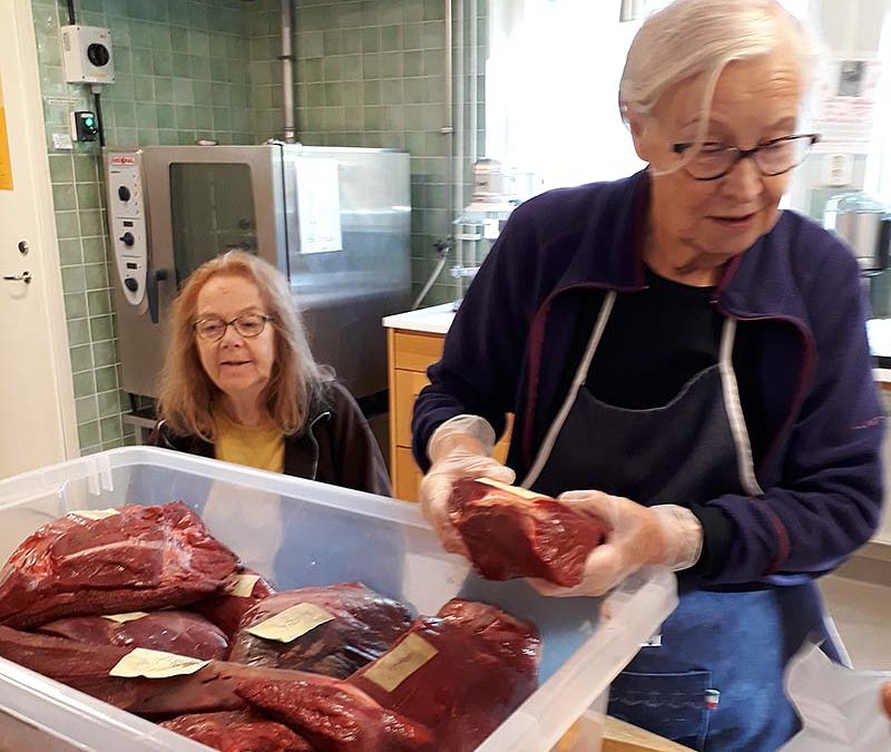Leverans av älgkött till våra fina fredagsmiddagar. Inköparna Britta och Barbro tar emot, delar upp och fryser in köttet. Därefter tar menygruppen och matlagen vid.